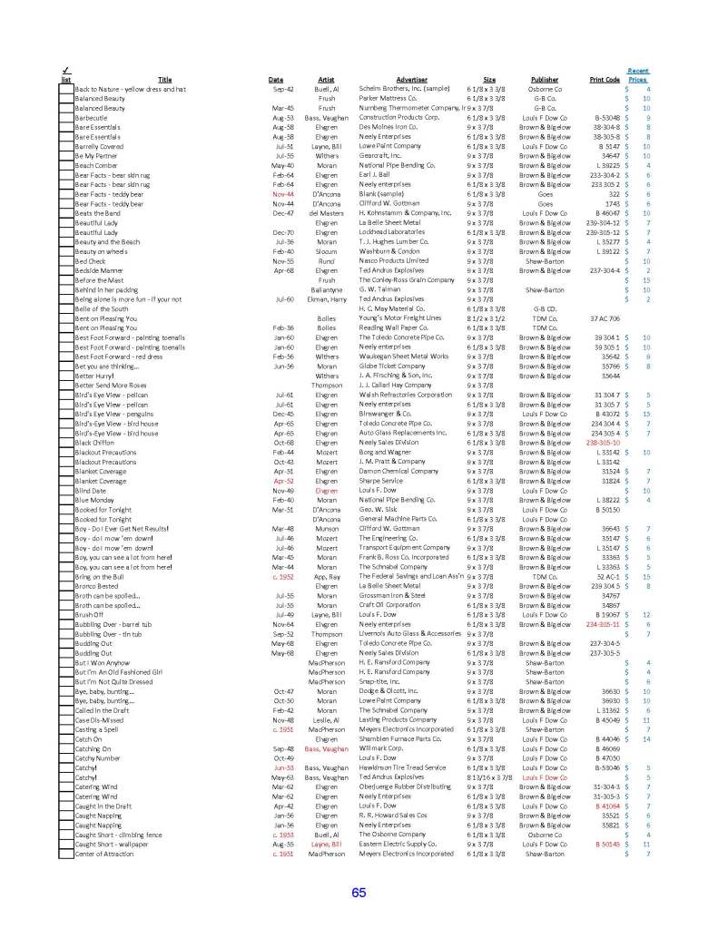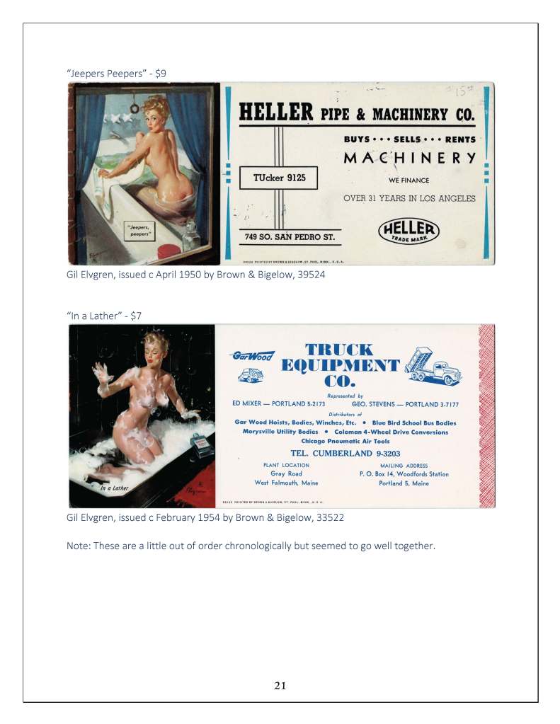 We have published an 80-page pin-up advertising ink blotter collectors guide, albeit an incomplete one, with more than 1,500 pin-up advertising blotters catalogued. The guide features 100 full-color pictures of pin-up advertising blotters from our personal collections as well as a checklist and useful tips on grading, collecting and determining the age of a blotter. Price including shipping in the United States is $29.95. International shipping can be arranged but is not included. Below are some sample pages: