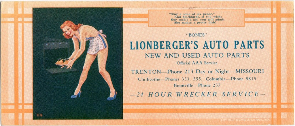 Sing a song of six pence. Posted byBlotto22September 13, 2024Posted inBlotter, Ink blotter, MontgomeryTags:Blotter, Ink blotter, James Montgomery Flagg, Montgomery, Pin-up Artist could have been James Montgomery Flagg but that is unconfirmed. Published in the 1940s for Osborne Co. Share this: Click to share on Reddit (Opens in new window) Reddit Click to share on X (Opens in new window) X Click to share on Tumblr (Opens in new window) Tumblr Click to share on Pinterest (Opens in new window) Pinterest Click to share on Facebook (Opens in new window) Facebook Click to email a link to a friend (Opens in new window) Email Like Loading... Related