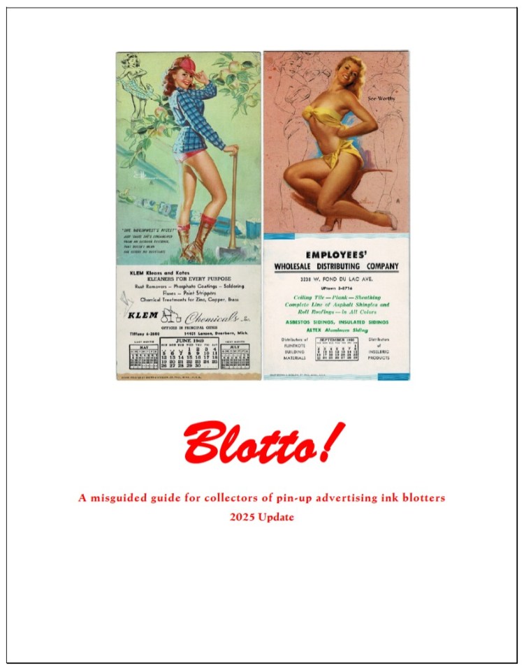 Both guides are largely complementary as the original Blotto! has more information about blotter dating, grading and collecting in general plus 100 blotter pictures by leading pin-up artists, while the 2025 Update has a more comprehensive checklist (about 1000 more blotter listings) and more recent prices. It features 30 pin-up blotter pictures as well. Buy them both at nearly a 25% discount!