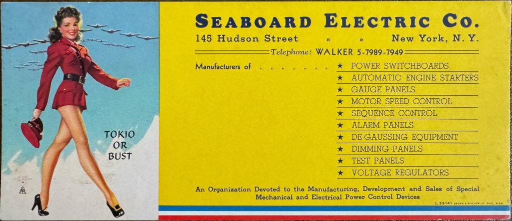Tokio or Bust Posted byBlotto22October 17, 2025October 10, 2025Posted inBlotter, Ink blotter, MozertTags:Pin-up, Blotter, Zoe Mozert, Ink blotter, Mozert Zoe Mozert pin-up published by Brown & Bigelow c. 1943, #L 33141 Share this: Click to share on Reddit (Opens in new window) Reddit Click to share on X (Opens in new window) X Click to share on Tumblr (Opens in new window) Tumblr Click to share on Pinterest (Opens in new window) Pinterest Click to share on Facebook (Opens in new window) Facebook Click to email a link to a friend (Opens in new window) Email Like Loading... Related